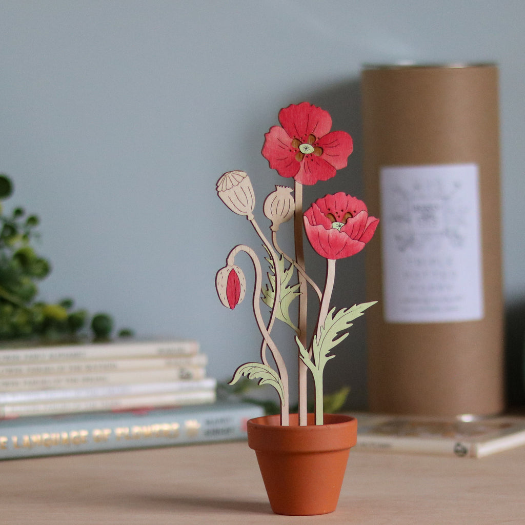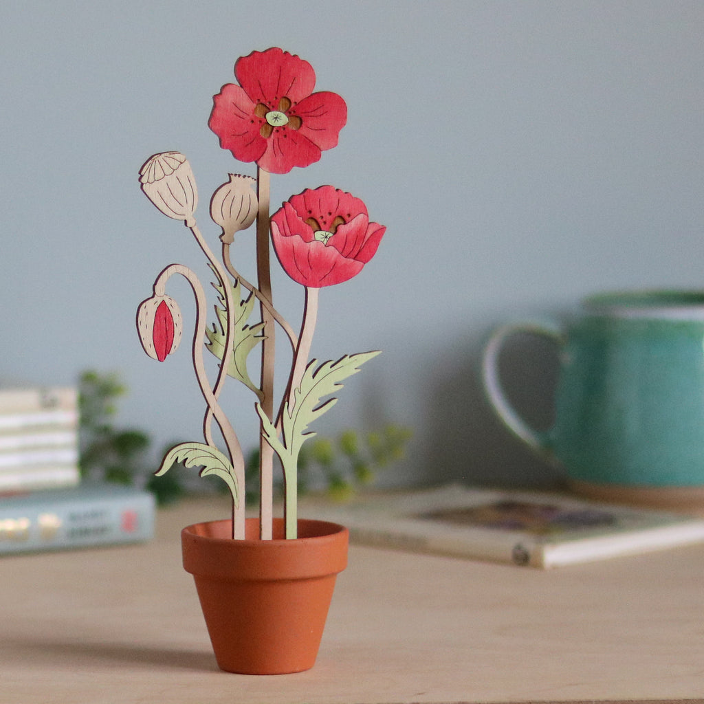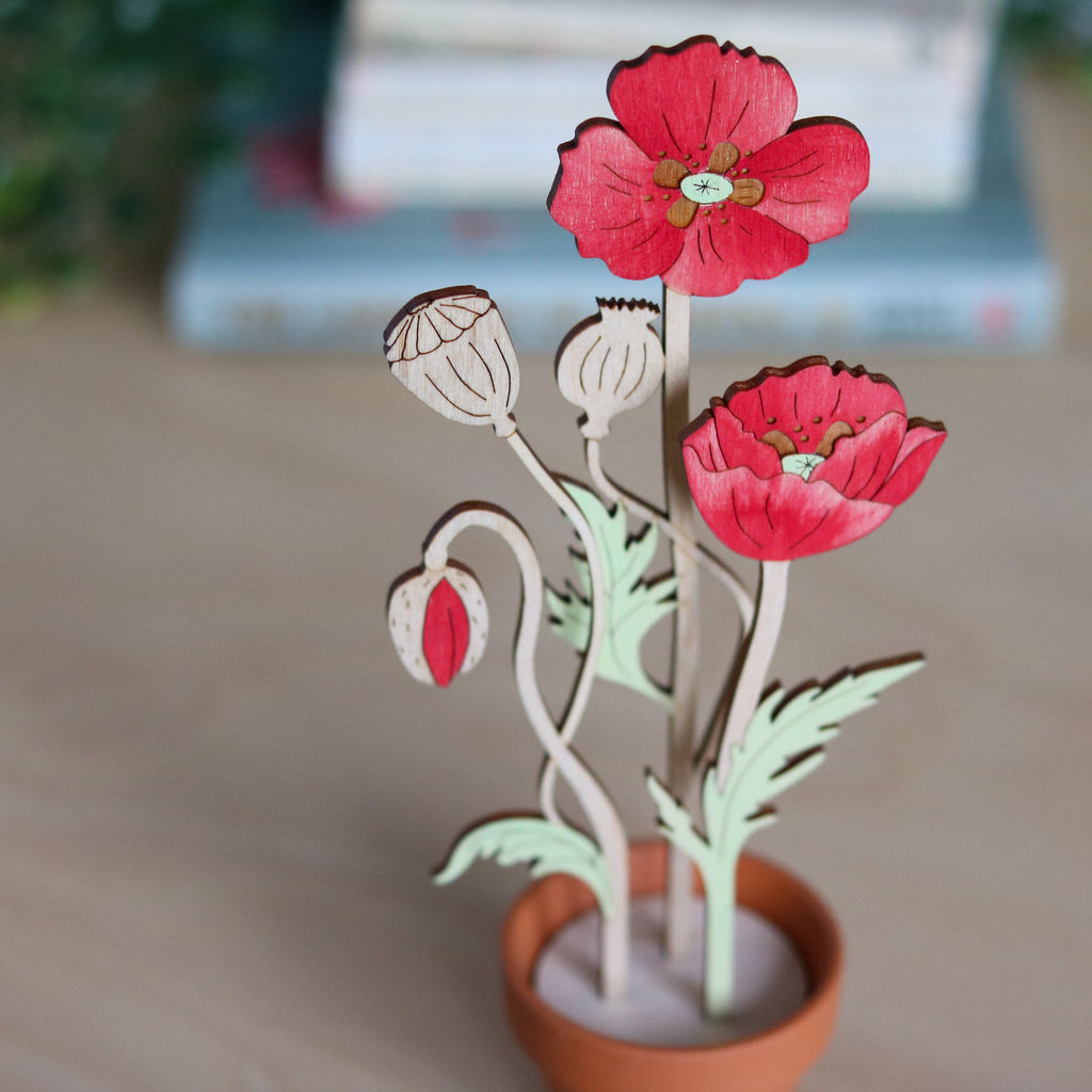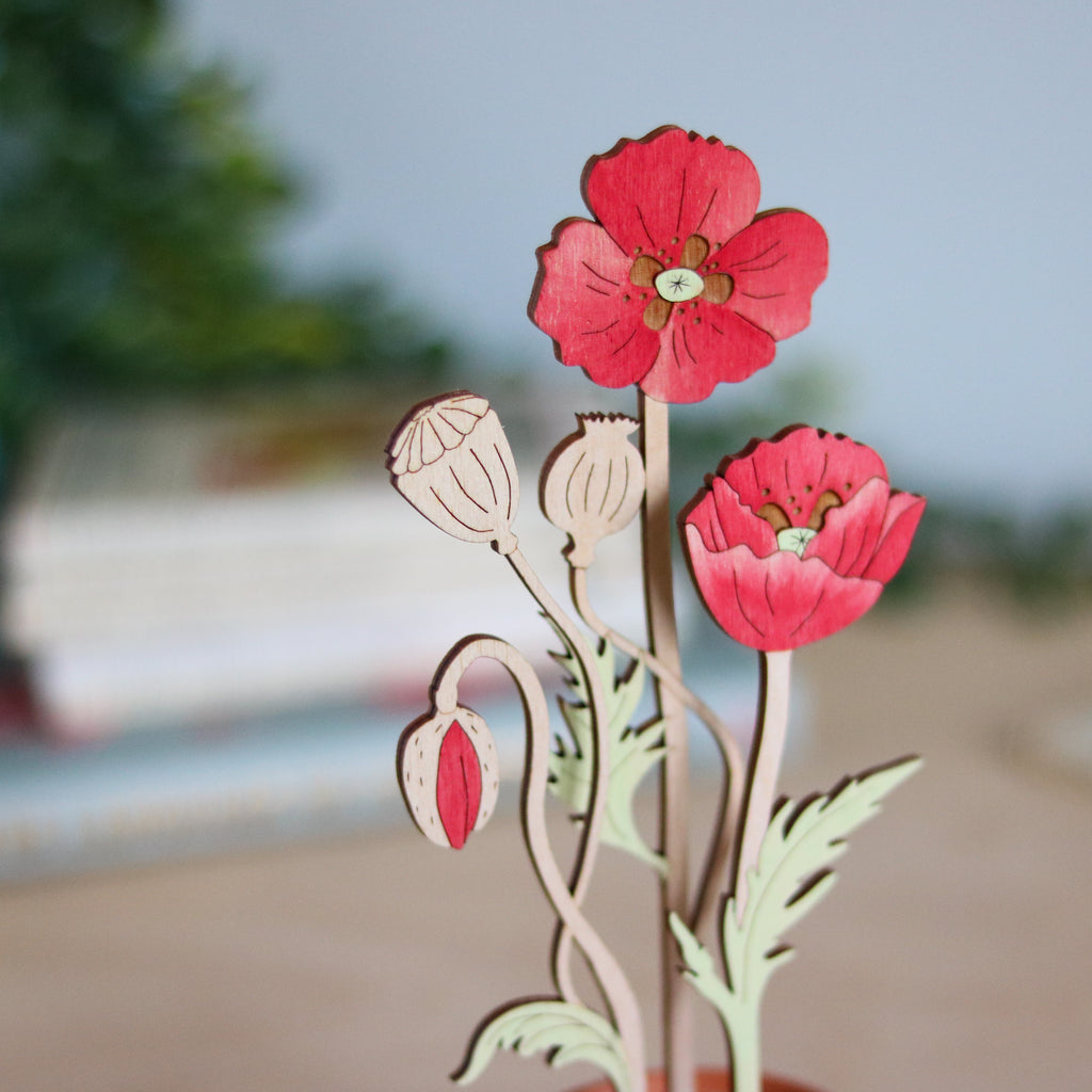 A trio of laser cut, hand drawn and hand-painted wooden Poppy stems at different stages of opening. Stood in a natural terracotta pot. A friendly bunch of blooms to add happiness and cheer to a shelf or favourite spot on the desk! Making a really special keepsake and gift.